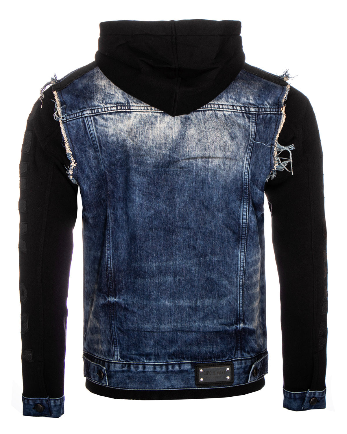 This combination of a denim-blue denim jacket and a black hoodie from Cipo & Baxx screams confidence and the spirit of rock'n'roll. Black sweatshirt sleeves and hood bring comfort to the classic jacket. Buy it and take the stage! Normal sizing.