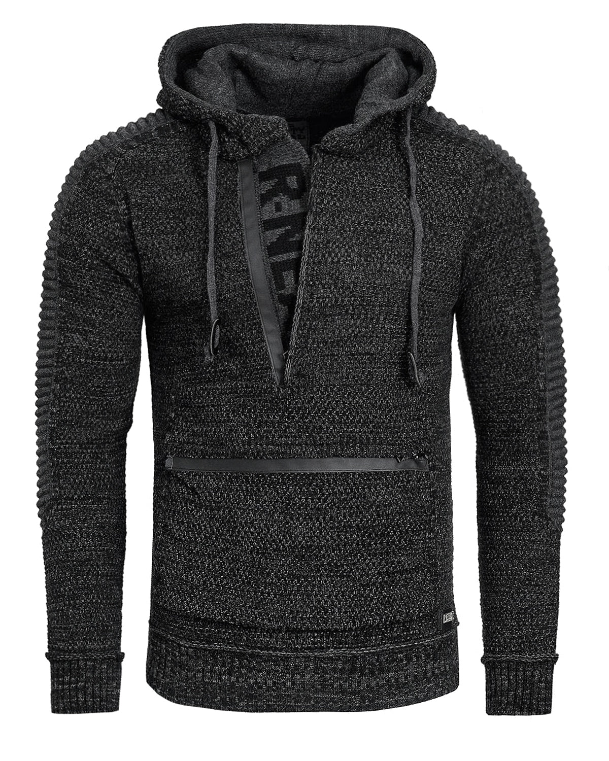 Men's black and gray knitted hoodie from MZ72 Brand. It features two front pockets and drawstrings on the hood. The interior is lined with soft and comfortable teddy fabric, making this hoodie perfect for colder weather! Small sizing.