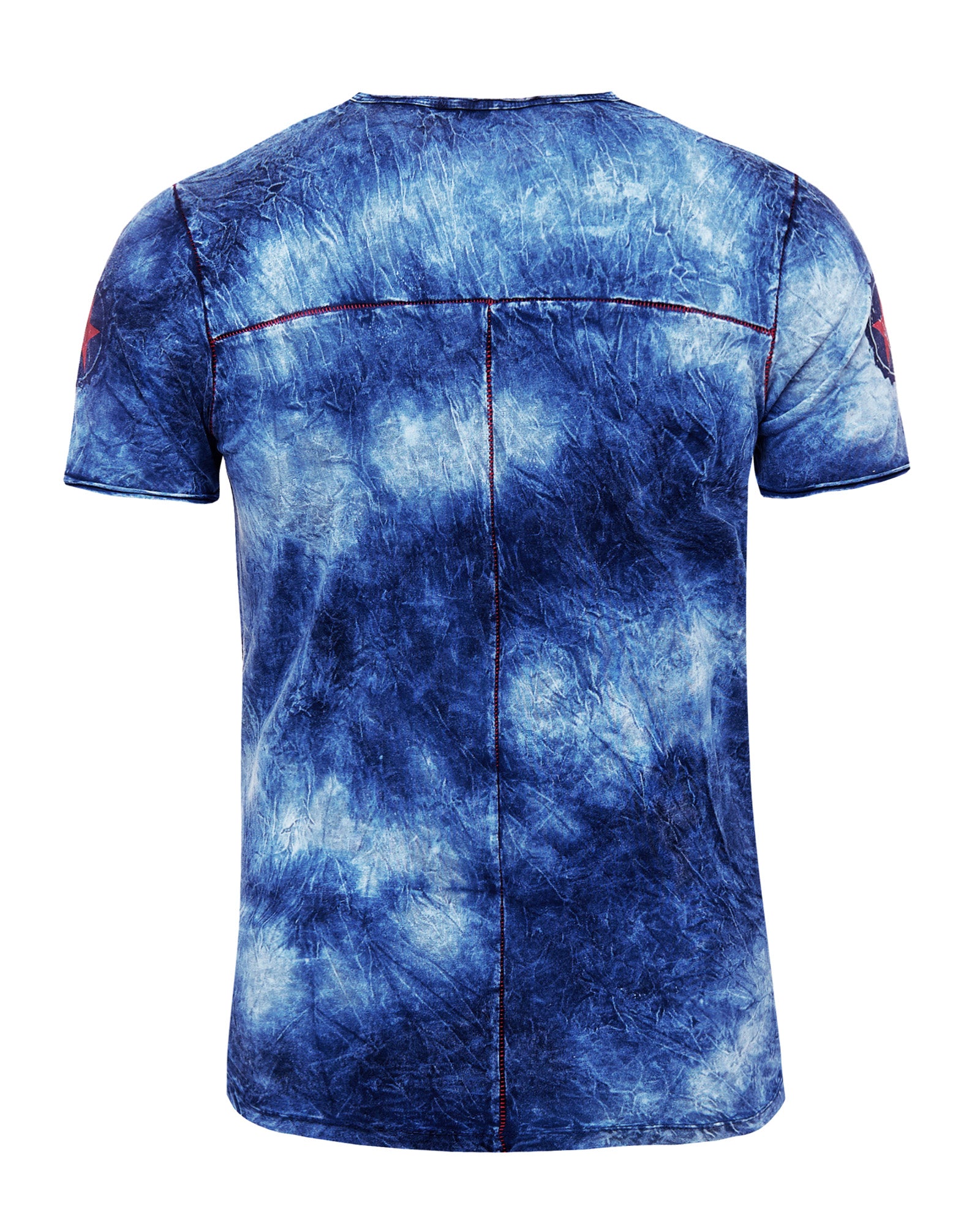 Miesten sininen t-paita brändiltä Rusty Neal. Koristetikkaukset kauluksen vieressä. Paidan värissä voi olla yksilöllisiä eroja. Normaalia mitoitusta.