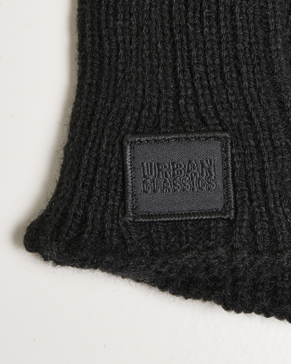 Mustat neuloksesta valmistetut älyhanskat brändiltä Urban Classics. Älysormikkaiden sormenpäissä on pinta, joka toimii hyvin kosketusnäytöllä.