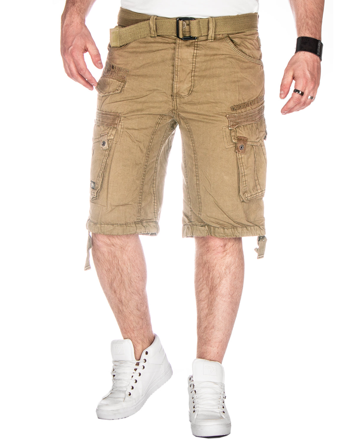 Miesten beiget shortsit brändiltä Geographical Norway. Lahkeissa ja vyötäröllä kiristysnyöri. Kuvan vyö tulee mukana. Shortseissa on yhteensä kahdeksan taskua ja nappikiinnitys. Normaalia mitoitusta.