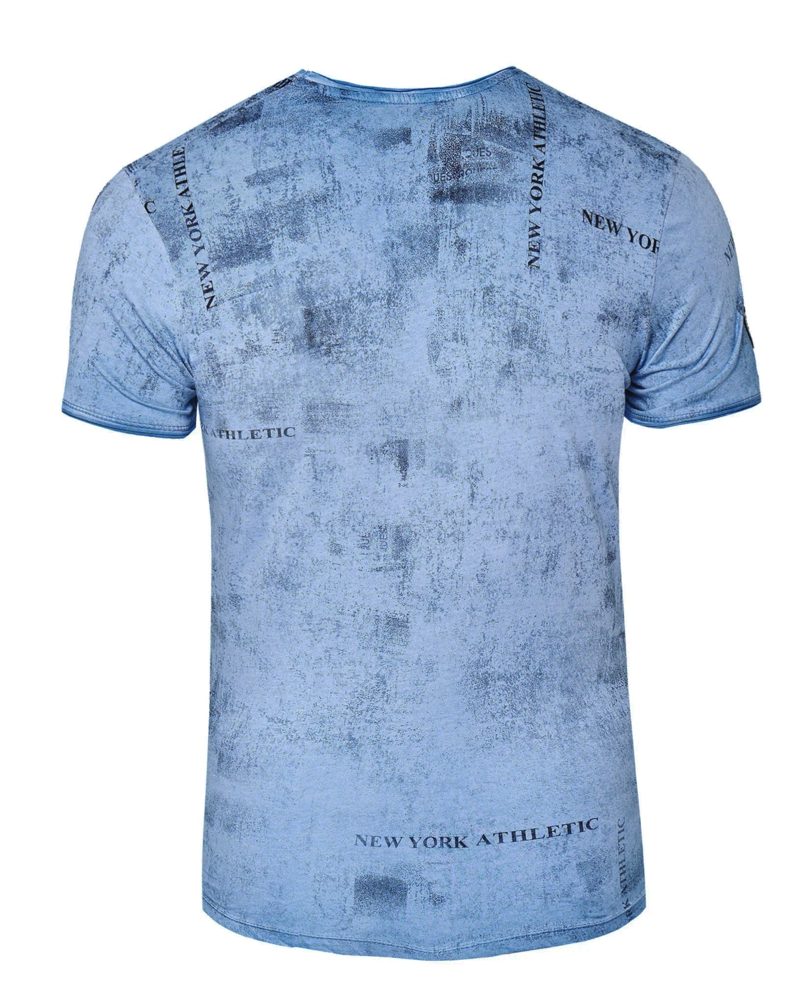 Miesten vaaleansininen t-paita brändiltä Rusty Neal. Paidan edessä- ja takana printtiä. Normaalia mitoitusta.
