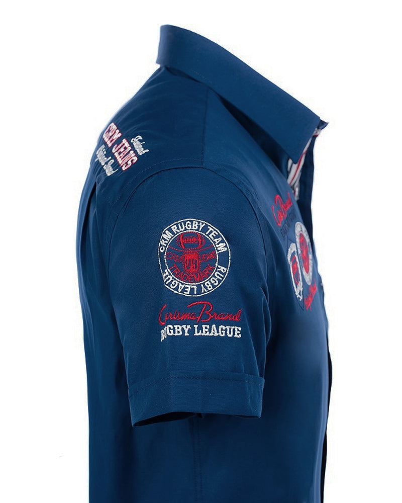 Miesten tummanisninen lyhythihainen kauluspaita. Brodeerausta edessä. Normaalia mitoitusta.