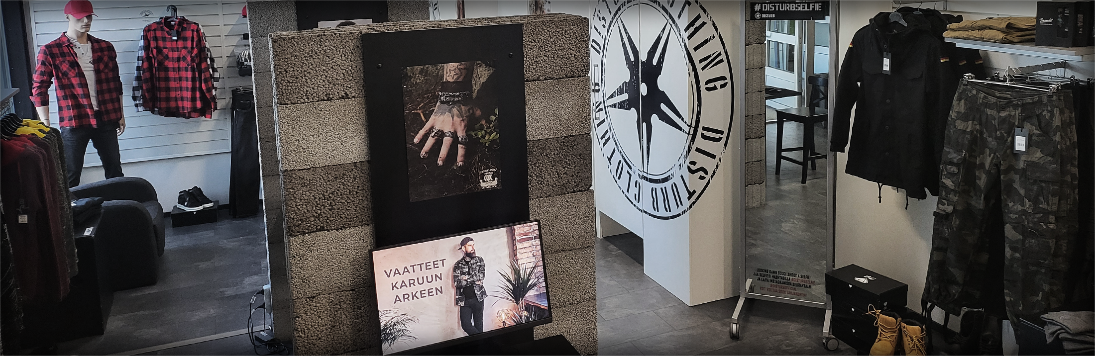 Välkommen till ett annan typ av klädbutik! Disturbs enda butik ligger i södra Lappland i Keminmaa med Disturbs lager. Vår liten butik har ett aktuellt urval av våra produkter. Hela sortiment av Disturb.fi kan ses från våra kund datorer, vilket gör det enkelt att välja produkter till provning. Betalning kan ske med kort eller kontant.