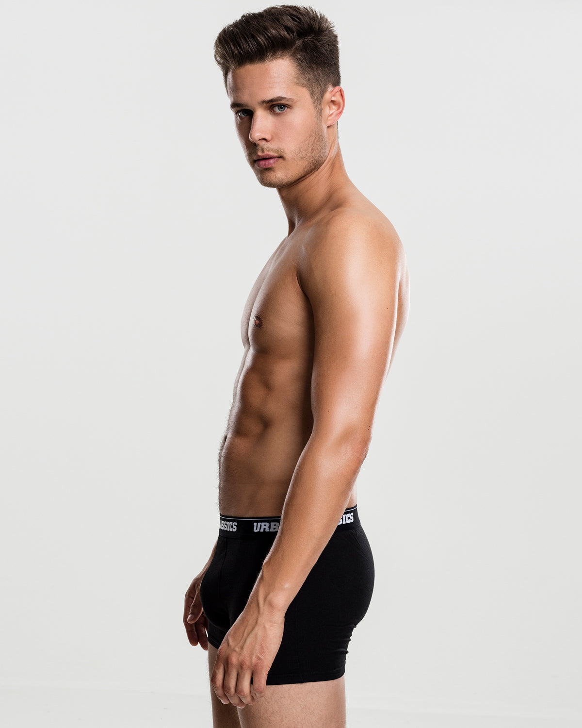 Svarta boxershorts för män. Resår är tillhandahållen av Urban Classics -med varumärkets logotyp. Förpackning med två boxershorts. Ha på dig underkläder när du provar boxers. Normal i storleken.