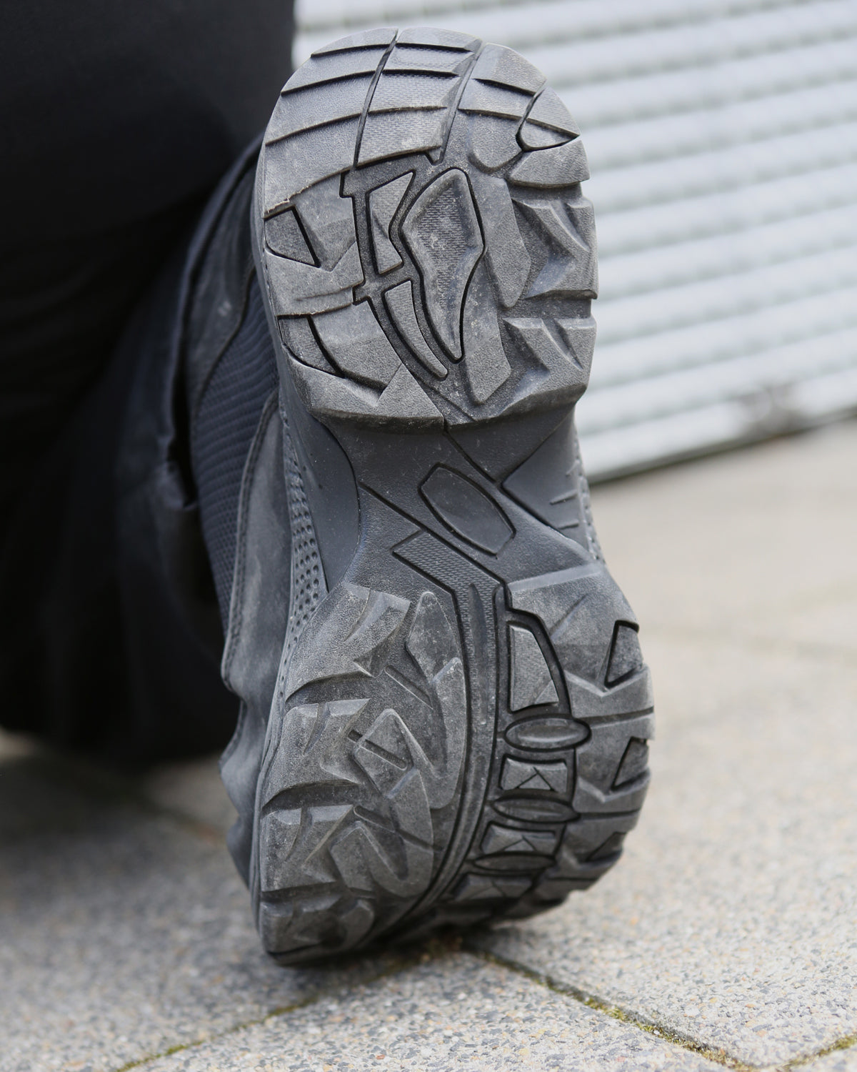 Svarta taktiska kängor för män. Skorna har åtta snörhål, halkfri sula och stöt- och vibrationsdämpning. Skorna håller värmen och är oljeavvisande.
